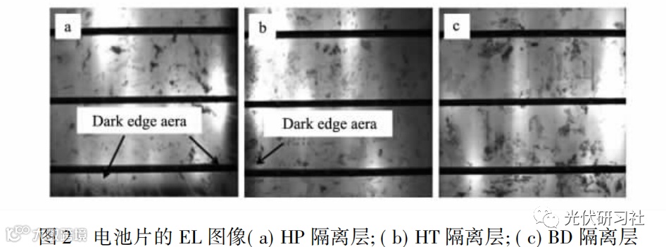 将硅片制作成电池片后,通过电致发光( Electroluminescence,EL) 测试仪所得图像的分析可以有效地发现电池片中存在的问题。硅方中残余的边部红区是电池片上形成 EL 黑边的主要原因。使用 HP 隔离层和HT 隔离层对应的电池片中存在一定黑边比例( 如图 2a、图 2b) ,而使用 BD 隔离层对应的电池片基本不存在黑片情况( 如图 2c) 。