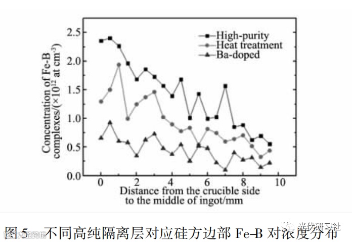 虽然在 ICP-MS 的检测中未观察到 BD 隔离层中杂质含量出现明显的上升,但是实际上仍存在部分坩埚本体中的杂质以及 BD 隔离层本身含有的杂质向硅锭中扩散,并导致硅锭中 Fe 浓度的升高。