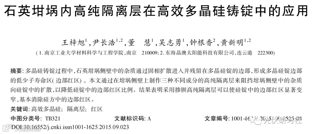 高纯隔离层能有效改善铸锭中的边部红区,而增强高纯隔离层的致密程度可进一步提高对硅锭边部红区的改善效果。本文尝试高温热处理和掺钡处理高纯隔离层进一步阻挡杂质污染硅锭。结果显示,相比高温热处理,掺钡能更有效地增加高纯隔离层的致密度,从而更有效地阻挡坩埚本体中的杂质向硅锭中扩散。