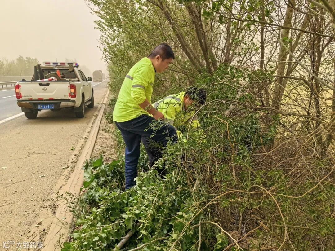 ▲3月17日,绥定分公司靖边路产养护管理中心高向华、徐元元,在大风天气下清理绿化带倾倒树枝