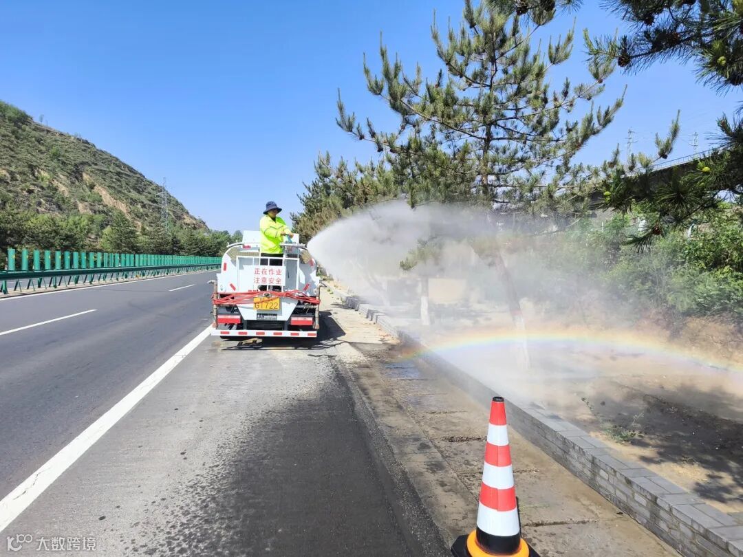 ▲5月18日,所属绥德路产养护工作人员高飞利用自备洒水车,在G20青银高速绥定段K1143+800处灌溉绿化物