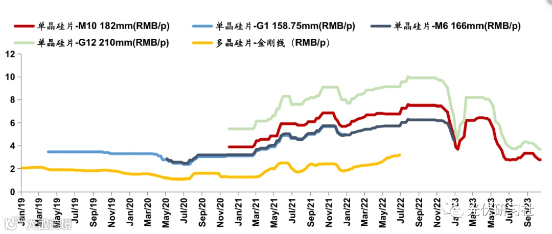 近期硅片环节整体排产提产,硅片部分尺寸规格出货压力仍较大,因此本周硅片价格尚未企稳,整体价格趋势仍向下。