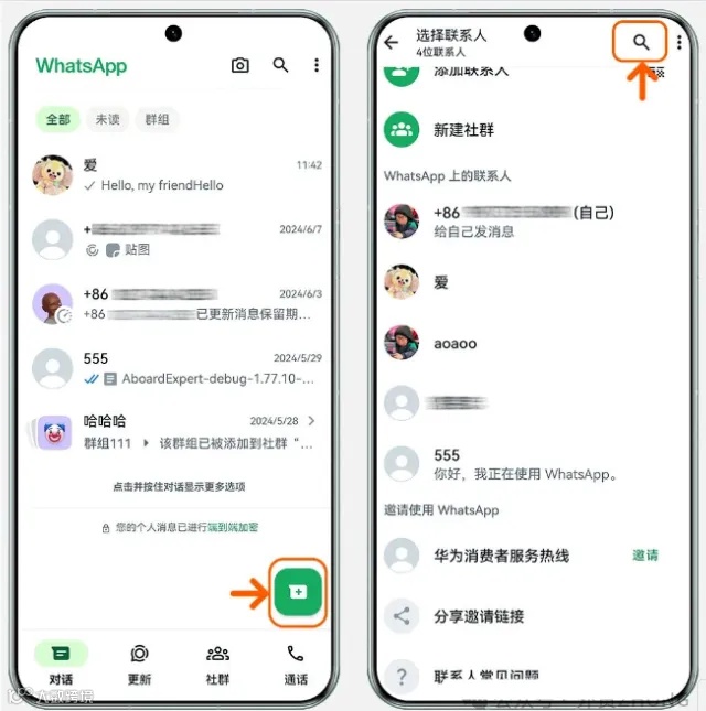 1.点+号发起新对话,可以看到有再使用WhatsApp的联系人或者尚未使WhatsApp的联系人(他没用你只能邀请他注册)