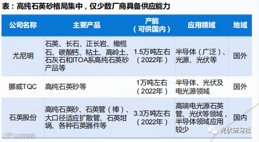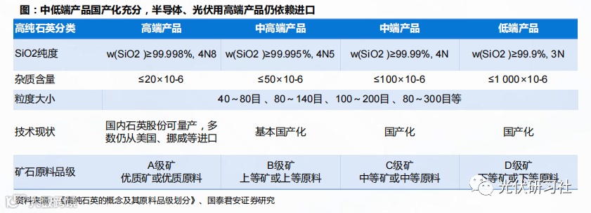 用于半导体、光伏的4N5以上产品国产化仍在路上。高纯石英砂从中低端到高端一般应用路径为光源行业(2N~4N)、高端光学器件、激光器件(4N以上)到半导体、光伏、光纤通信、微电子等领域(4N5~6N)。我国在3N~4N中低端产品上已完成国产化,而4N5以上产品受制于矿石原料品级以及提纯技术,仅个别头部厂商具备生产能力。国内厂商在光伏用高纯石英砂上已实现突破,国产化率逐步提升,而应用于半导体的产品技术壁垒更高,且受限于长周期的验证工作,仍基本从国外进口。