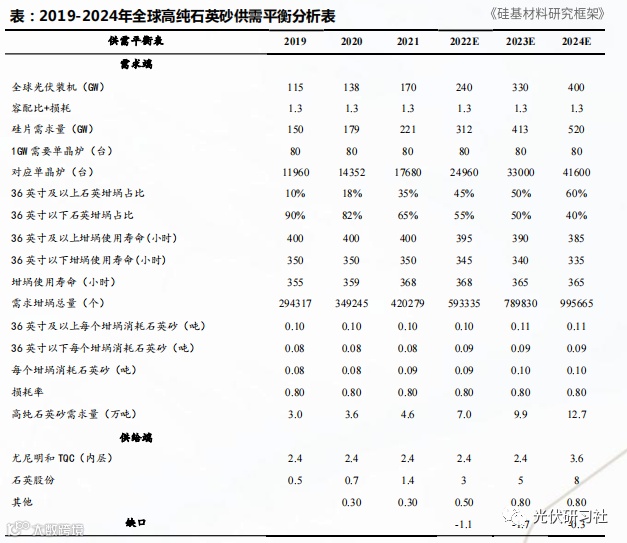 高纯石英砂2024年预计延续紧缺态势。我们估算海外龙头尤尼明及TQC对于中国出口高纯砂规模22-23年保持2.4-2.5万吨基本不变,2024年可能会新增产能1.2万吨(目前看大概率实现不了这个体量)。而国内供给除了石英股份外,基本没有确定性的增量。据CPIA数据,判断2023年光伏装机规模达到330-360GW,同比可能继续保持30%以上的增长。