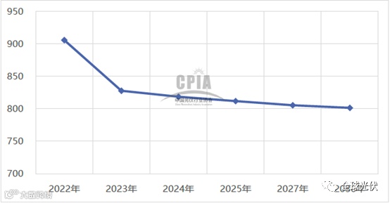 2022 年,多晶硅片平均厚度为175μm,由于市场终端需求量较小,无继续减薄的动力,因此预测2024 年之后厚度维持170μm 不变,但不排除后期仍有变薄的可能。