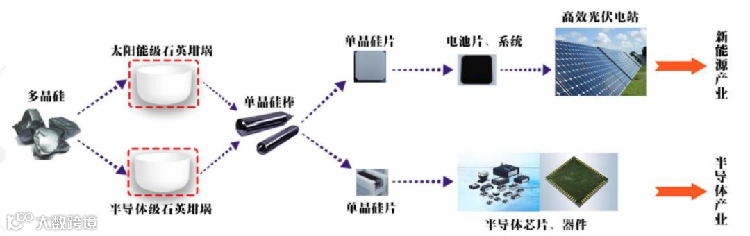 石英坩埚产业上游为高纯石英砂,下游应用领域广泛,以半导体和光伏为主,其中光伏市场需求增长较为迅猛。