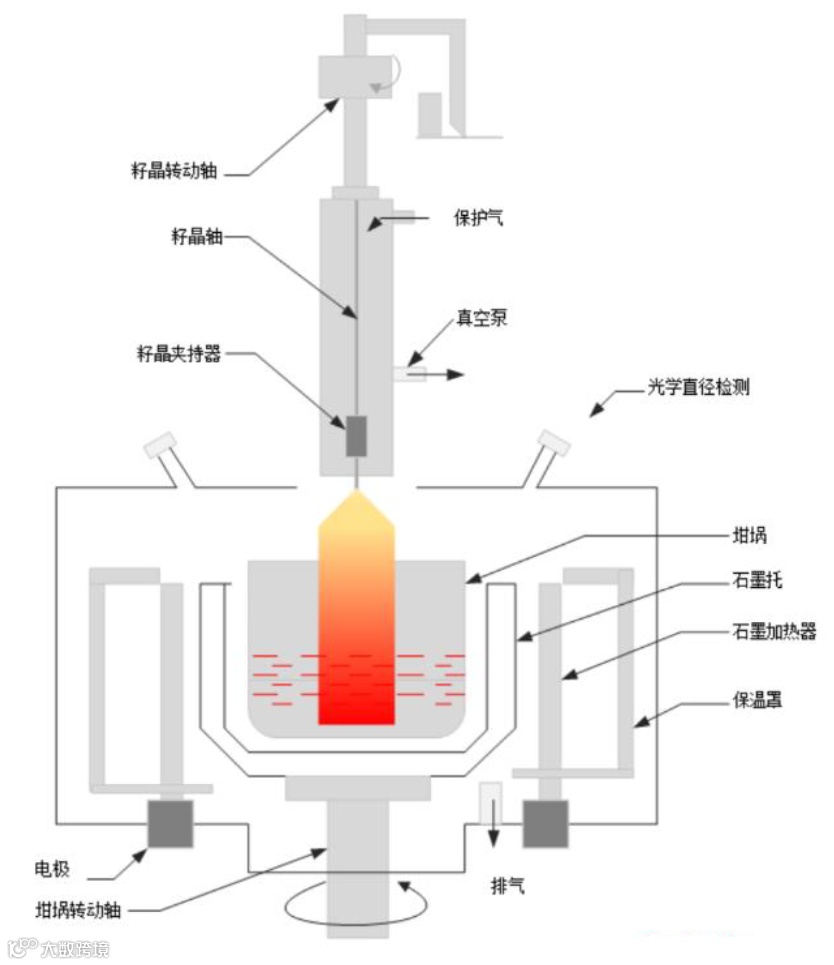 在直拉法中,将多晶硅原料放置于石英坩埚内加热熔融状硅熔体,拉杆带动籽晶下降使其接触硅熔体,然后缓慢地向上提拉籽晶从而形成硅单晶棒。