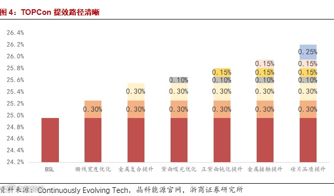 3)TOPCon电池提效路径清晰。目前TOPCon量产效率与28.7%的理论极限效率相比仍有很大的优化空间,提效路径更为清晰明确。光伏电池提效方法主要有光学性能提升(如栅线变细、材料吸光性能优化)和电学性能改善(如钝化提升)两大类方法,以晶科能源为例,其效率优化路径以金属栅线宽度优化、金属复合提升、背面吸光优化、钝化优化、金属接触优化、硅片品质提升等几方面为主。