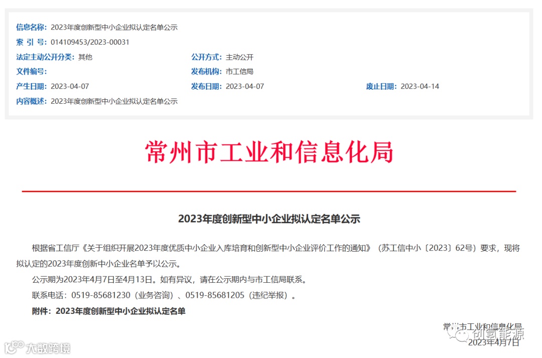 创氢能源2023年4月7日,根据省工信厅《关于组织开展2023年度优质中小企业入库培育和创新型中小企业评价工作的通知》(苏工信中小【2023】62号)要求,常州市工业和信息化局将拟认定的2023年度创新中小企业名单予以公示。