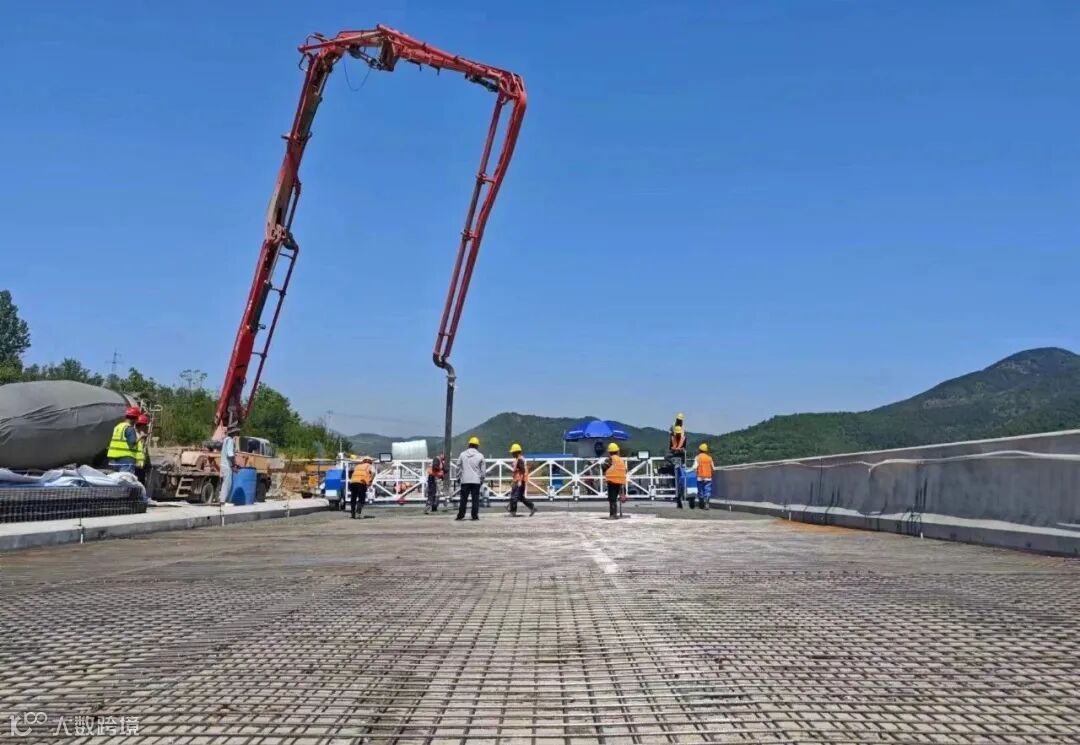 为提高桥面铺装质量和减少混凝土干缩裂纹等问题,项目引入并优化桥面摊铺施工工艺,打造高效化、智能化、自动化集一体的激光桁架式辊轴摊铺机及泵送混凝土桥面铺装施工工艺。