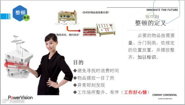 在工作现场选择适当地方摆放需要物品,首先决定物品属于哪一类别,建立标识工作区域及物品的系统(列明物品名称存放位置及数量),通过小组沟通,寻求解决方法,有效推行识别系统以达成有条理储存需要物品(