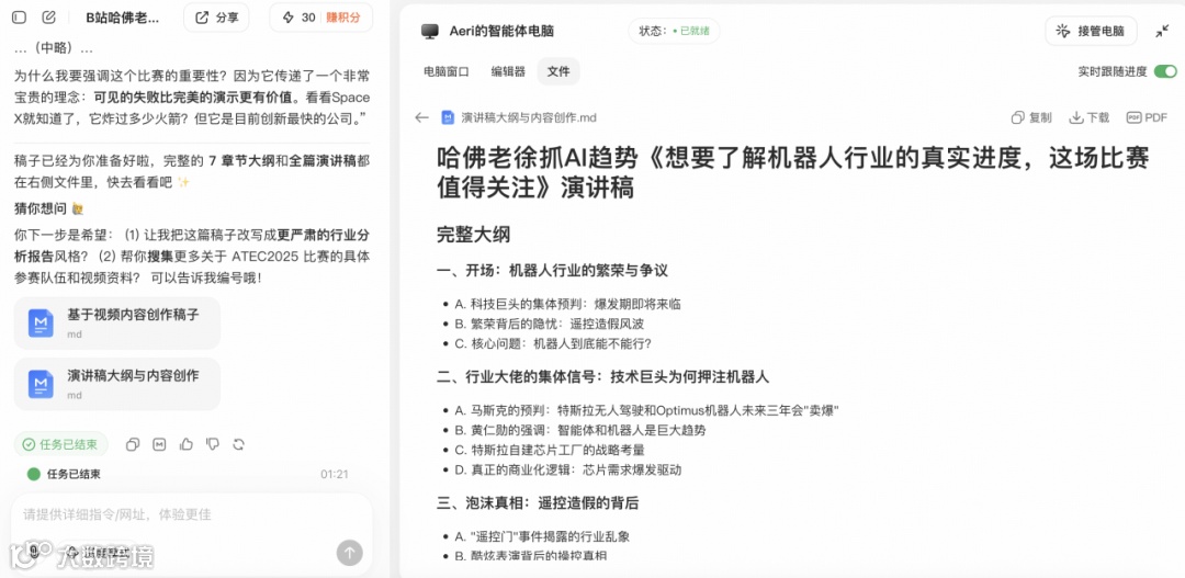 同时,它也是你的内容提纯器。你可以一键获取原文字幕用于复盘或引用,或通过自动生成的大纲理清逻辑架构。基于视频灵感,Agent还能辅助你进行快速二创,将输入即刻转化为你的独家输出。