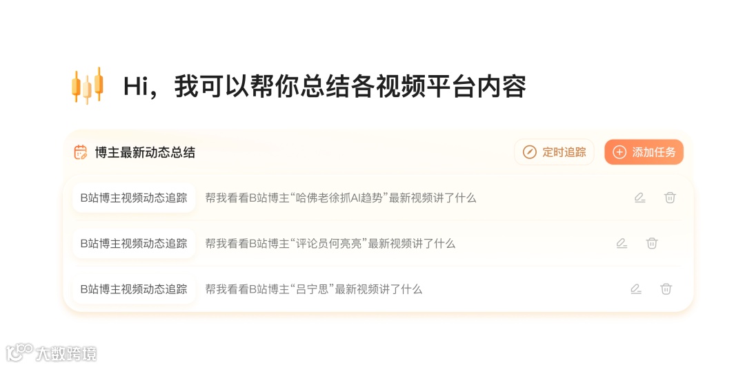 你可以把你常用的指令设为“快捷任务”,比如“追踪抖音小Lin说的最新短视频”。这些任务会变成看板上的小卡片。你只需要点一下,Agent 就会立刻行动:自动扫描目标平台、抓取最新视频并生成可读的摘要。
