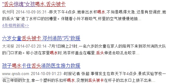2014年10月,读小学三年级的杭州小女孩小玲(化名),用小水杯喝水时,竟被卡住舌头,救援人员赶到时舌头已经充血肿胀,经过两个多小时的救援,才把水杯口拿了下来。