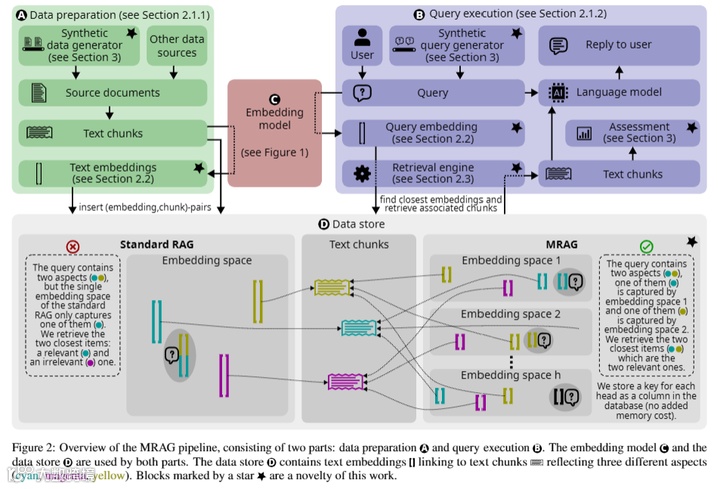 这篇论文介绍了一种新的解决方案——多头检索增强生成(MRAG),以应对需要同时检索多个内容上差异较大的文档的多方面问题。传统的RAG方法主要关注于单个文档的检索,而对于需要同时获取多个文档的情况,由于这些文档在嵌入空间中的距离可能很远,因此难以全部检索到。MRAG通过利用Transformer的多头注意力层的激活作为检索多方面文档的键,而不是解码层,来解决这个问题。因为不同的注意力头可以学习捕捉不同的数据方面,利用相应的激活可以得到代表数据项和查询各个方面的新嵌入,从而提高复杂查询的检索准确性。论文提供了评估方法、指标、合成数据集和现实世界用例来证明MRAG的有效性,结果显示,在标准RAG基线上的相关性改进最高可达20%。MRAG可以与现有的RAG框架和基准工具(如RAGAS)以及不同类别的数据存储无缝集成。
