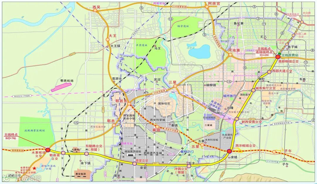 ——高新至鄠邑高速复合通道工程为西沣路-鄠周眉高速东延伸的复合立体通道,路线全长38.6km,其中上层主路为双向六车道高速公路,路基宽度33.7米,设计速度120公里/小时;下层辅路为双向八车道城市主干路,设计速度60公里/小时,红线宽度60米,项目总投资177.8亿元,采用PPP(BOT)建设模式,西安高新区管委会为项目实施主体。项目工可尚未批复,正在办理相关手续。该项目建设对于提高项目通道通行能力和服务水平、缓解西安市城市交通拥堵、加快沿线城镇土地开发、提高城市运行效率和综合竞争力具有重要意义。