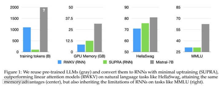 本文提出了一种名为Scalable UPtraining for Recurrent Attention (SUPRA)的方法,该方法可以在有限的计算资源下,将现有的大型预训练变换器(transformer)模型转换为循环神经网络(RNNs)。这种转换方式既利用了变换器模型强大的预训练数据和性能,又避免了训练大型线性变换器所需的昂贵计算成本。尽管这种方法在标准基准测试中取得了有竞争力的性能,但作者发现,即使是最大的线性模型,在持续上下文学习和长上下文建模方面仍存在不足。