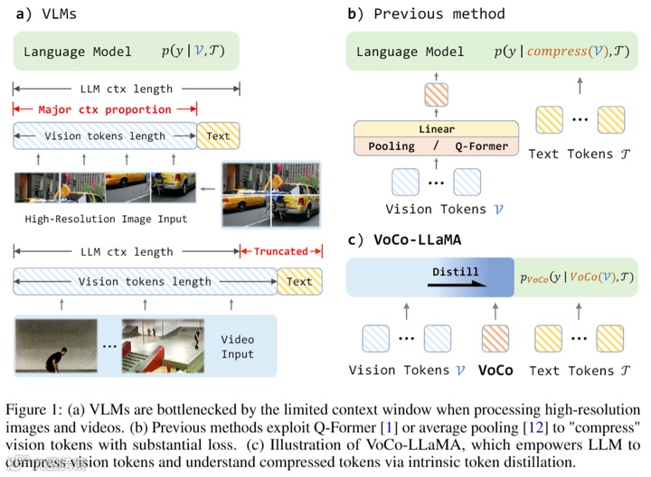 本文介绍了一种新的视觉压缩方法VoCo-LLaMA,这是首次利用大型语言模型(LLMs)来压缩视觉令牌。传统的视觉压缩方法通过使用外部模块来压缩视觉令牌,并迫使LLMs理解压缩后的令牌,这常常导致视觉信息损失。然而,在压缩学习过程中,并没有充分利用LLMs对视觉令牌的理解方式。VoCo-LLaMA通过在视觉指令微调阶段引入视觉压缩令牌,并利用注意力蒸馏,将LLMs对视觉令牌的理解方式传授给它们处理VoCo令牌。这种方法可以有效地压缩视觉信息,并在推理阶段提高计算效率,压缩比达到576倍,使得浮点运算次数(FLOPs)减少了94.8%,推理时间加速了69.6%。此外,通过使用时间序列压缩的令牌序列对视频帧进行连续训练,VoCo-LLaMA展示了理解时间相关性的能力,在流行的视频问答基准测试中超过了之前的方法。这项研究为解锁视觉语言模型(VLMs)上下文窗口的潜力提供了新的途径,使得多模态应用更加可扩展。