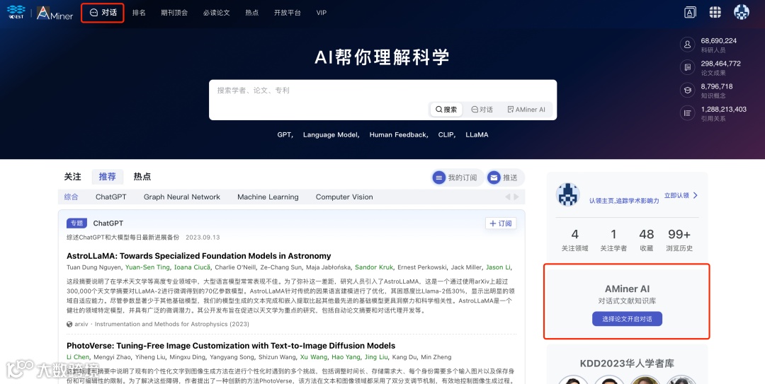 使用AMiner AI的方法很简单,打开AMiner首页,从页面顶部导航栏或者右下角便可进入AMiner AI页面。