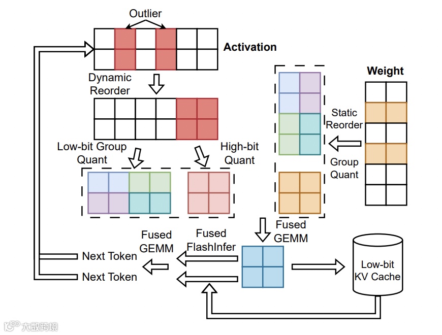 为了解决这个问题,作者提出了Atom,一种低位量化方法,能够在几乎不损失准确性的情况下实现高吞吐量提升。通过使用低位操作器和低位量化,Atom显著提高了服务吞吐量,并通过应用一种新颖的混合精度和细粒度量化过程来实现高准确性。作者在服务环境中评估了Atom在4位权重激活量化设置上的表现,结果显示,与FP16和INT8量化相比,Atom将端到端的吞吐量提高了最多7.73倍,同时保持了相同的延迟目标。