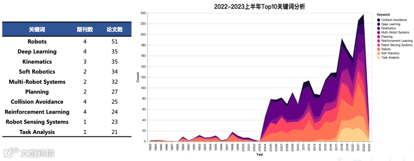 2022 年到 2023 年上半年的高频关键词反映了机器人学科的最新研究焦点,关注度最高的关键领域包括机器人硬件与软件综合研究、深度学习、机器学习、路径规划和碰撞避免。同时,近年来,深度学习和强化学习等人工智能技术的发展呈现出明显的增长趋势。这反映出机器人学科正在积极融合新兴技术,以推动机器人系统朝着更智能、自主的方向发展。