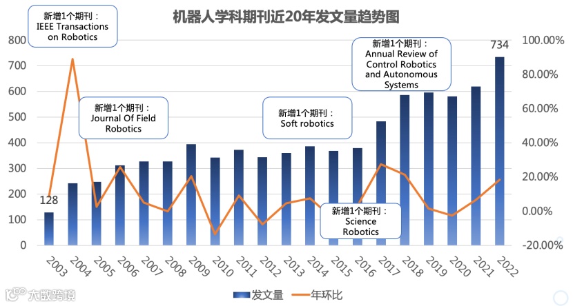 整体来看,近 20 年来,机器人学科的研究发展迅猛,所受关注度持续暴增。在过去的 20 年里,SCIE 的 Robotics 学科一区收录期刊从 2 个上涨到 7 个,所刊登的论文数量增加了近 6 倍。回顾 2003 年,两个期刊共计有 128 篇机器人学科论文发表,仅一年后,随着《IEEE Transactions on Robotics》的创刊,论文数量急剧增加了 89.1%,标志着机器人学科领域逐渐壮大的开端。在此后的近 20 年中,机器人相关期刊从 3 个期刊逐步增加至 7 个期刊,刊登论文数量整体呈上涨趋势,2022 年刊登的论文数量达到了 2003 年的将近 6 倍,代表着该学科领域的研究持续蓬勃发展;与此同时,近年来新创刊的期刊也为该学科的研究者提供了更多专业化、多样化的机会,如 《Annual Review of Control Robotics and Autonomous Systems》主攻机器人自动控制相关研究。