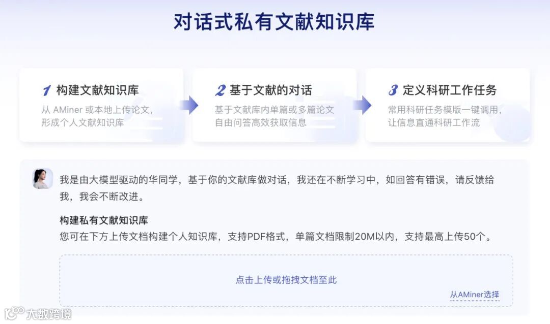 在ChatPaper页面中,可以选择基于单篇文献进行对话和基于全库(个人文献库)对话,可选择上传本地PDF或者直接在AMiner上检索文献。