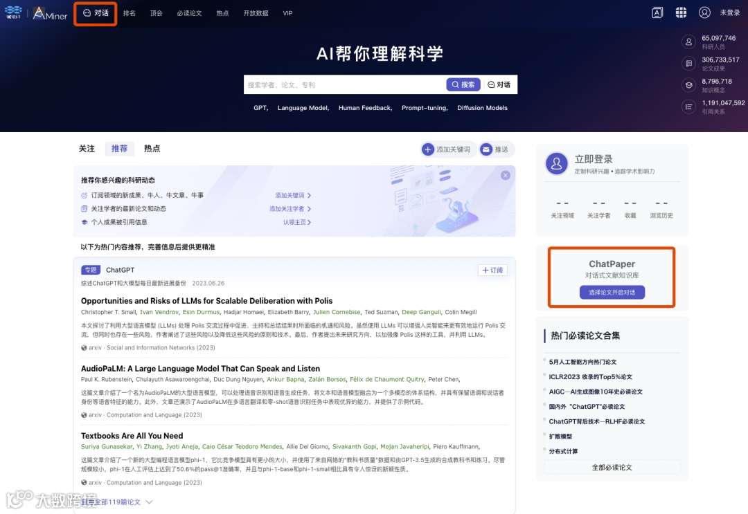 使用ChatPaper的方法很简单,打开AMiner首页,从页面顶部导航栏或者右下角便可进入ChatPaper页面。