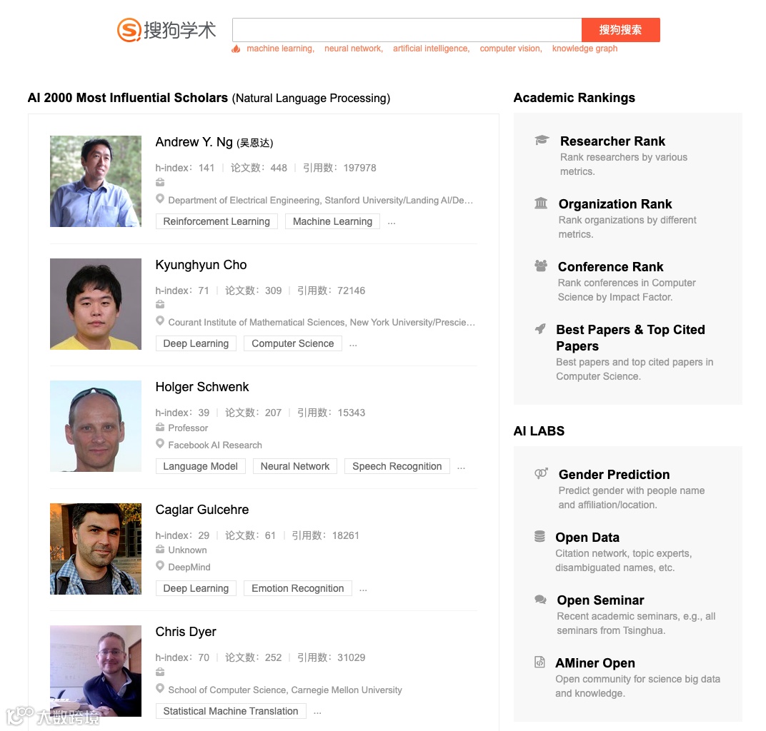 AMiner和搜狗学术合作已经酝酿良久,在基于人物搜索的基础上,增加了论文搜索,正式实现了全方位搜索。进入搜狗学术主页之后,可以根据关键词、论文名称或者学者名称直接进行搜索,还可以通过下方更多信息框获取会议、期刊、开放数据集等学术信息。