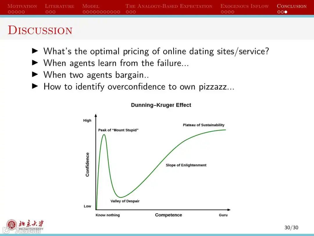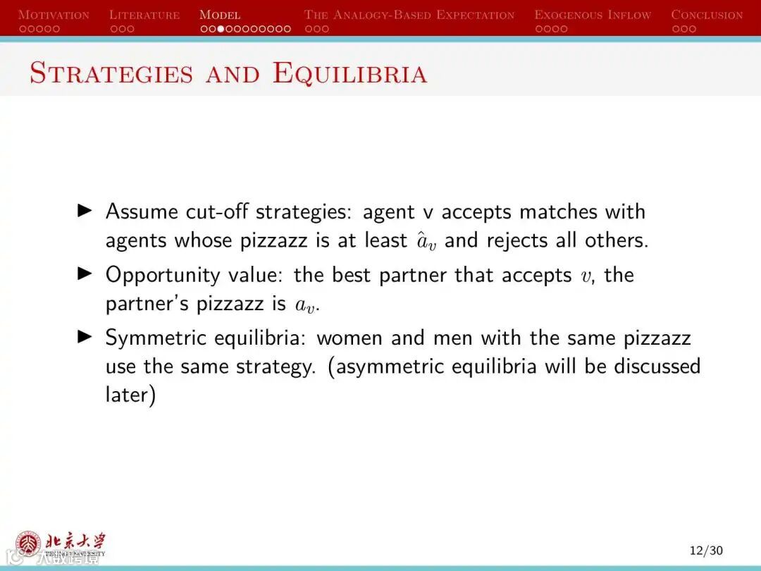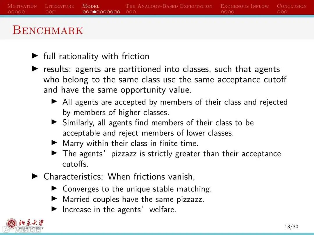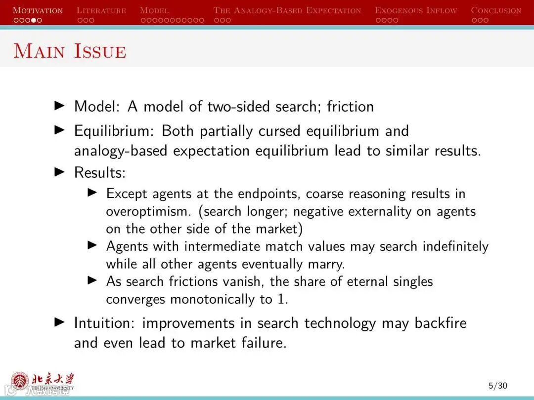 第二种情况下,人们的信念受到同类人的影响,即人们能够正确认识魅力值与自己相差很大的个体接受自己的概率,但误认为魅力值与自己相似的个体接受自己的概率相同。这会将人们划分为不同的群组,群组规模越小,越接近于理性人情形。这种情况下的市场均衡属于基于类比的期望的均衡(the analogy-based expectation equilibrium)。同样地,当市场摩擦减少时,匹配的数量降低,更多人无法在婚姻市场获得匹配。