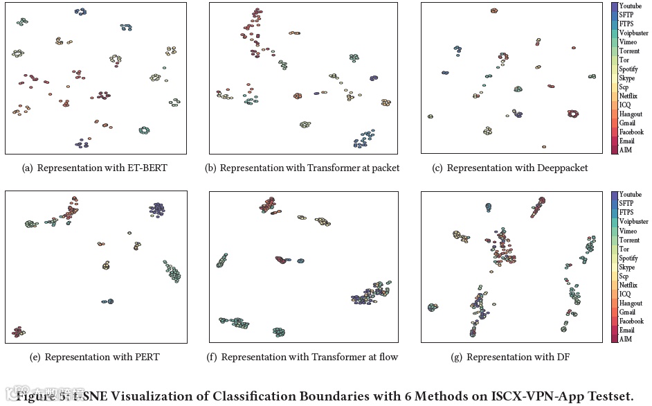 如图5所示,研究者通过分类结果的可视化展示ET-BERT的性能表现出色,在多类别的样本类内距离以及类间距离的边界识别更加清晰,对于流量特征近似的类别也能够保持较低的错检率。
