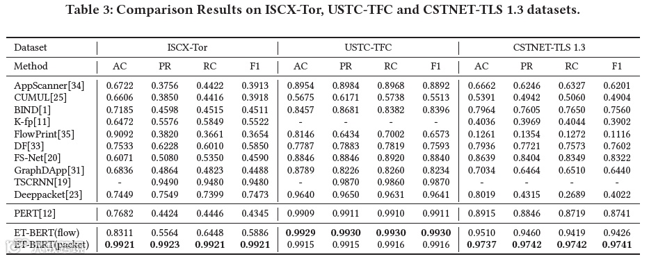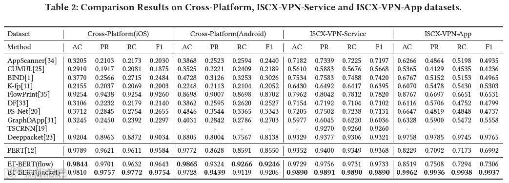 研究者将ET-BERT模型和五个场景下的11个代表模型在所有场景任务中进行了比较,包括AppScanner,CUMUL,BIND,K-fp,FlowPrint,DeepFingerprint,FS-Net,GraphDApp,TSCRNN,Deeppacket和PERT。表2和表3中报告了具体的结果。