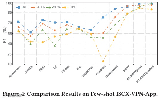 如图4所示,通过压缩训练数据规模和实验测试,研究者表明ET-BERT相比其他典型代表方法在3种不同规模的小样本场景下展现的性能更加稳定,即使在10%的数据规模量级(50左右)下仍保持90%左右的macro-F1结果。