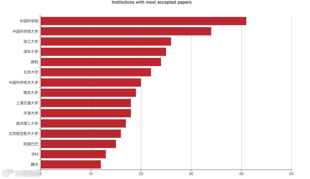 2.从论文所属机构来看,中国科学院组合高居榜首,入选论文共计42篇。微软和浙江大学排名第二,28篇论文入选。清华大学排名第三,都有26篇入选。国内高校中国科学院入选论文最多,排在总榜的第1位;浙江大学有28篇入选,排在总榜第2位。