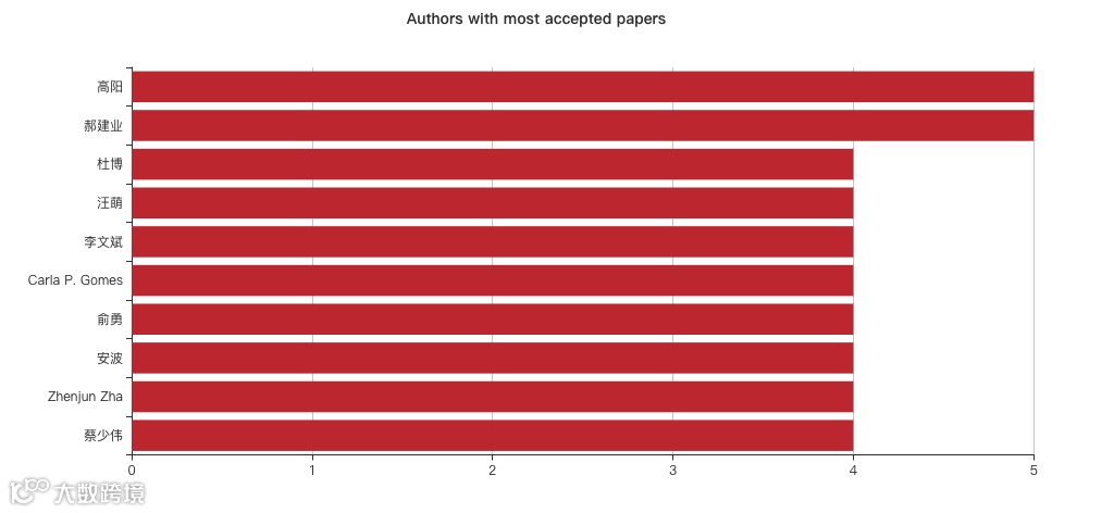 1.南京大学高阳、郝建业两位华人学者被 IJCAI 录用论文高达5篇至多,杜博、汪萌、李文斌、俞勇、安波、查振军、蔡少伟等华人学者也被录用了4篇论文,表现抢眼。