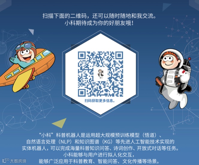 科技周上的小明星小科是一个科普机器人,由北京智谱华章科技有限公司出品,清华大学唐杰教授领导团队研发。可以完成海量科普知识问答、诗词创作、人设问答和开放式对话等任务。“小科”的科普能力来源于海量的互联网数据,这些数据由大规模知识图谱协助组织,通过云服务的方式使得它可以针对不同问题给出最合理的回答。