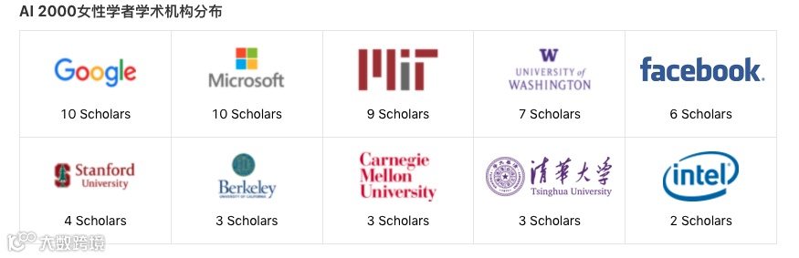 具体到各大机构,谷歌和微软都有10名女性学者入围,麻省理工学院有9位,紧列其后。其他前10的学术机构包括华盛顿大学,脸书,斯坦福大学,加州大学伯克利分校,卡内基梅隆大学,清华大学和因特尔公司。