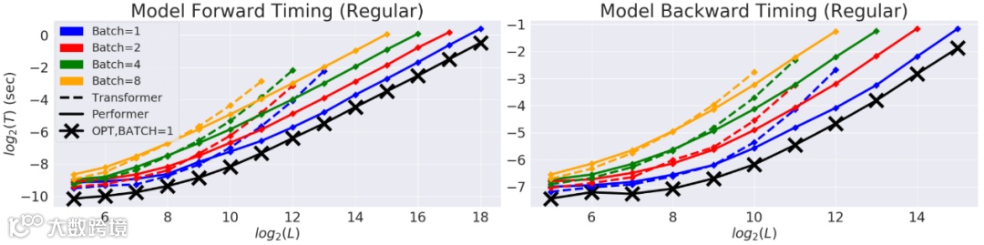 在以时间(T)和长度(L)为度量的双对数坐标轴中,常规 Transformer 模型的双向 timing。行方向的终点是GPU内存的极限。黑线(X)表示使用 "虚"注意力块时可能的最大内存压缩和加速,它基本上绕过了注意力计算,代表着模型可能的最大效率。Performer模型在注意力部分几乎能够达到这种最佳性能。