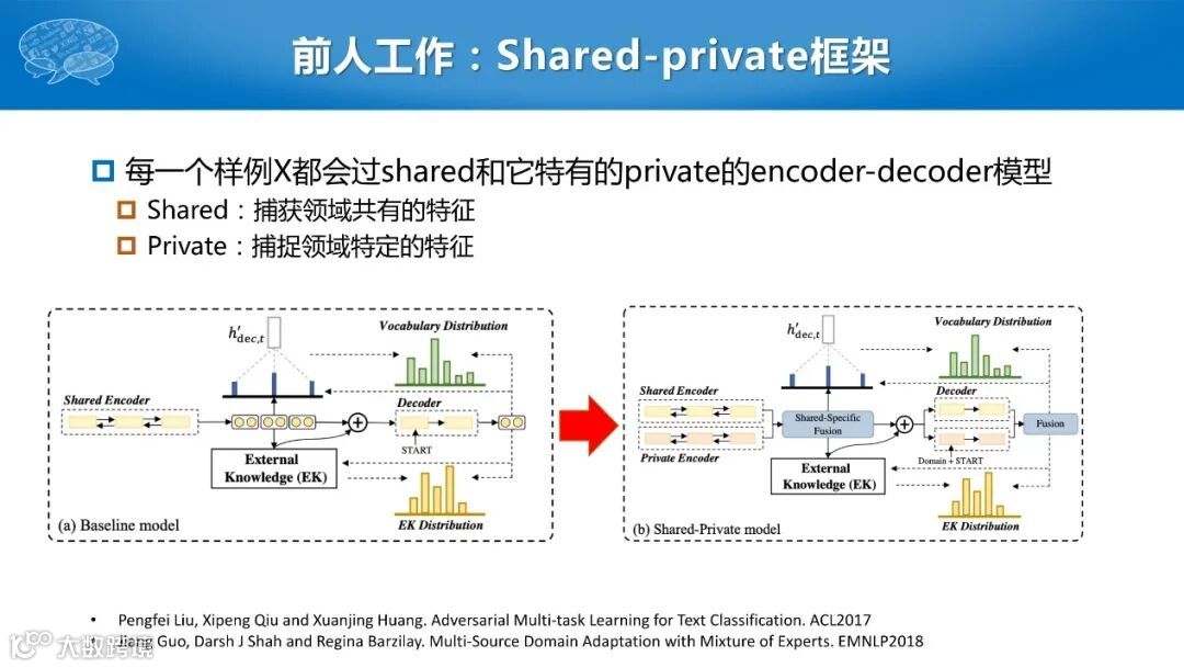 一种最简单的方法就是把多个领域的数据进行混合来共同训练,但是这样简单地共享一套参数难以捕获所有领域的特征,从而忽略了领域之间独有的特点。前人的一个方法叫做共享-私有框架,就是把这些数据混合、变成共享的模块,再针对每个领域做私有的模块。但是,这种encoder和decoder的方法仍然是将每个领域逐个利用,忽略领域之间的细粒度关系,缺少领域之间交互的信息。