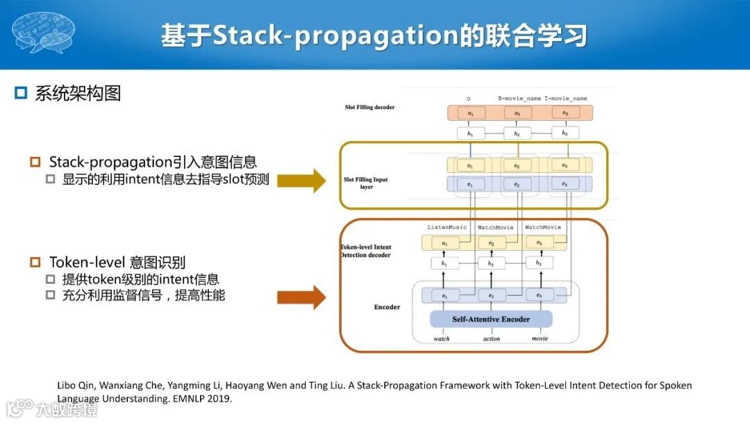因此我们提出一种新的多任务学习框架Stack-propagation,改造了传统的多任务学习方法,即找到任务A的同时支撑任务B、使两者产生联系,把任务A的结果输入给任务B,从而完成更好的多任务学习的方式。