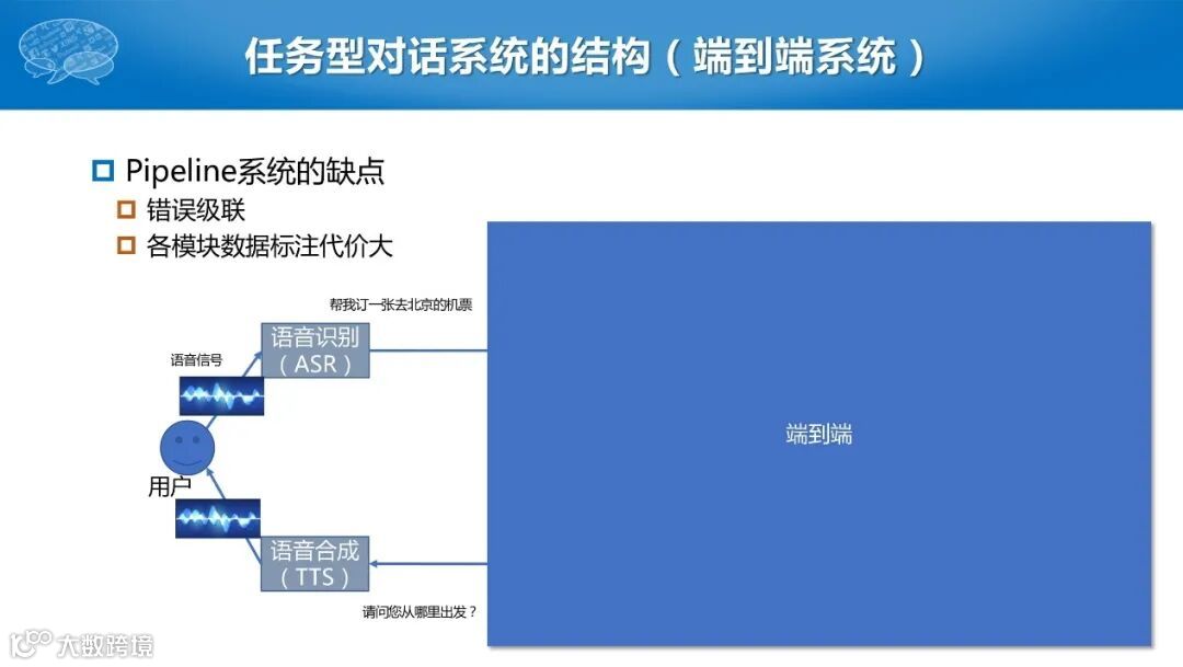 但是,由于经过多重步骤,某个步骤出错会牵连其他步骤,这种传统Pipeline的方式存在错误级联的问题。另一方面,各个模块标注的代价也较大。为解决这个问题,NLP研究者们提出端到端的对话,抛开中间的步骤,直接根据用户的输入以及相应的输出训练模型。