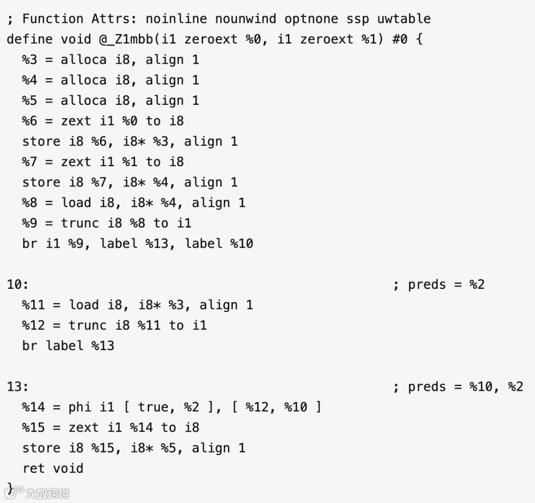 但是在这个时候由于SSA的原因%14只能被赋值一次,所以继而引入了phi指令。简单来说,就是根据当前block的前驱block(preprocessor)来决定当前的值。