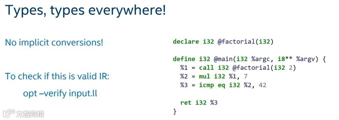 3.LLVM IR是一个typed language,任何一个语句都会带类型,比如%1 = alloca i32, align 4分配一个i32的local变量,另外这句话其实是通过CreateAlloca函数生成的