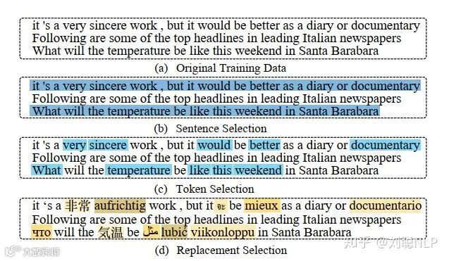 值得注意的是,源语言中的单词在目标语言中可能有多种翻译结果。在这种情况下,该论文随机多种翻译结果中的任意一个作为替换目标语言词语。该论文任务尽管不能保证这是上下文中正确的对应翻译,但可以将其视为任务中的数据增强(增加部分噪音)策略之一。