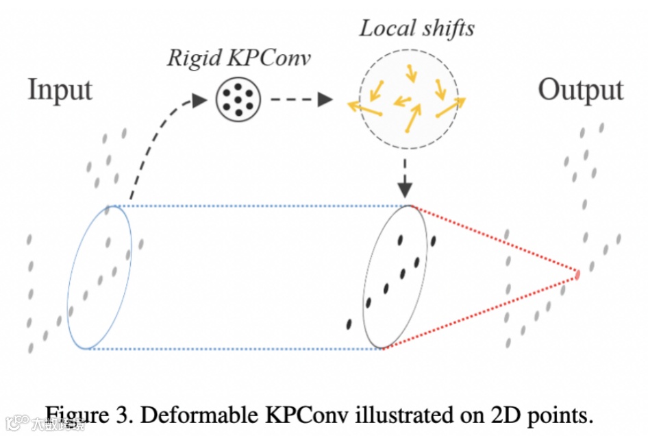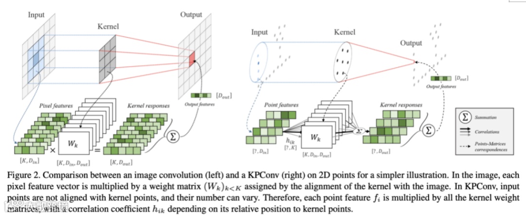 同时kpconv提出了kernel point convolution,KPC其实是在模拟一个卷积的过程。对于每一个输入的点,他会去查找K个最临近的kernel point,接着会计算相关性。卷积的weight其实是这些相关性的加权求和。最终的output feature会是输入特征跟这些权重的加权求和。