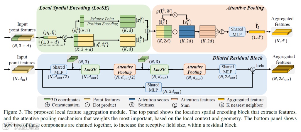 基于点云的几何特性,提出了Local spatial encoding。首先在给定的局部的邻域中,LocSE计算一下几何信息,比如所有点的均值、方差等。接着,利用pointwise的特征提取器(fc/conv1d)的layer进行特征的提取,通过local-neighborhood attentive-pooling达到set-abstraction。