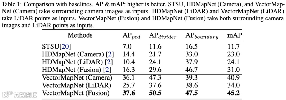 作者在nuScenes上进行了对比实验。从指标精度上来看VectorMapNet的性能相较于上一版HDMapNet有比较大的性能提升,尤其在Ped Crossing和Divider这两个分类上面。