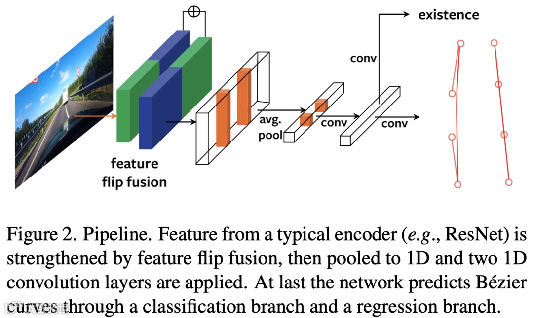 作者观察到,贝塞尔曲线模型有足够的参数自由度,能够表征驾驶场景中的车道线线型。该曲线模型具有计算复杂性低、高稳定等优势,并且曲线参数模型拟合的方式也可以避免其他冗余的后处理(例如NMS)以及手动设计Anchor。这些优势都使得整体模型能够更加简洁高效。