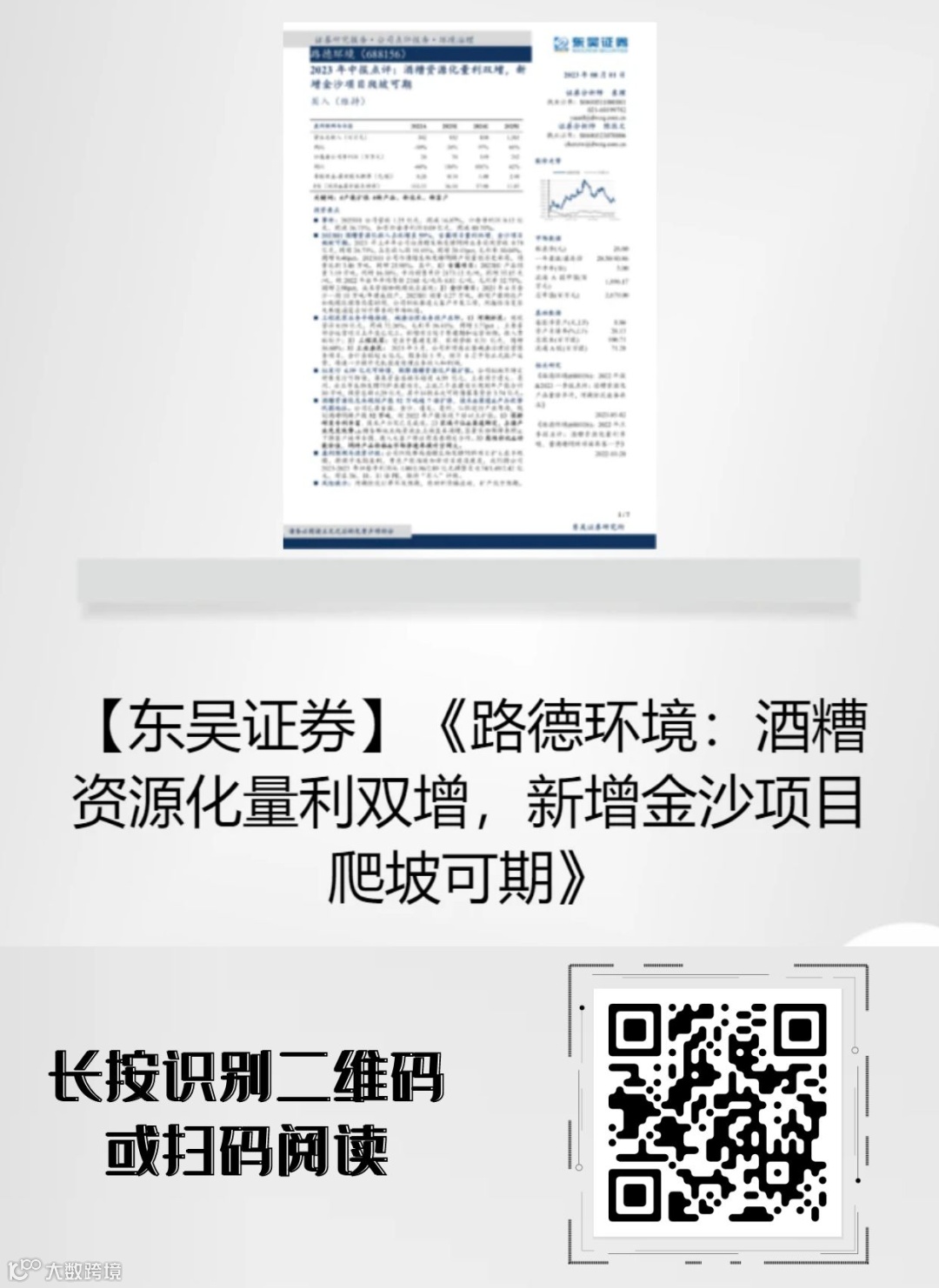 【路德·研报】东吴证券点评路德环境:酒糟资源化量利双增,新增金沙项目爬坡可期